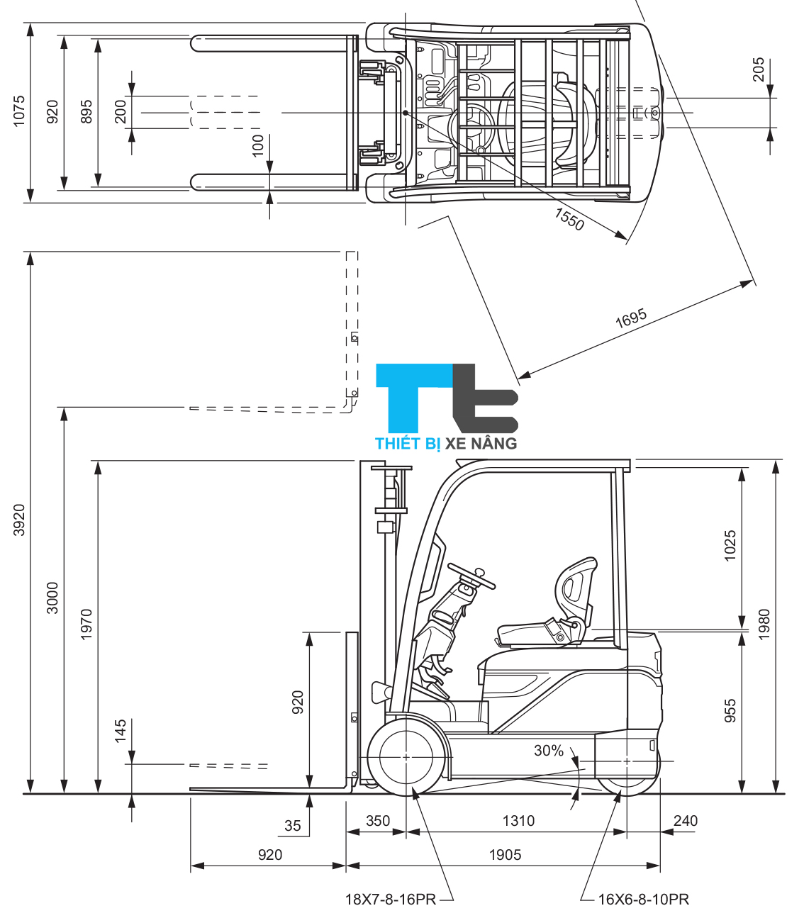 Hình vẽ tổng thể xe nâng điện 1.8 tấn Toyota | 3 bánh - Ngồi Lái |